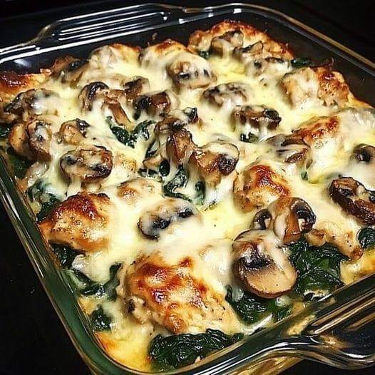 1) In a 9×13 pan, lay out chicken in single layer, top with spinach and mushrooms. Then sprinkle the seasonings over the top.